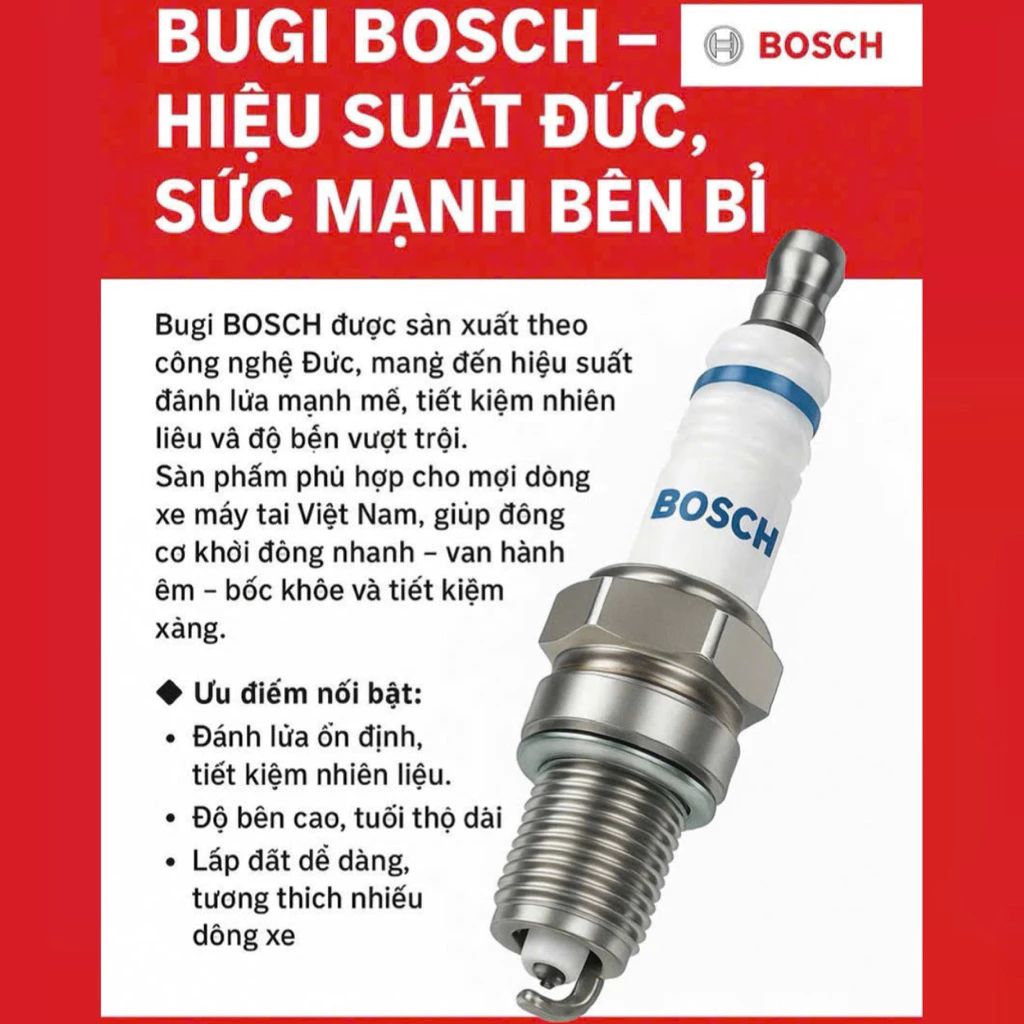 Bugi (Bộ Đánh Lửa) Xe Máy Bosch Chân Dài (Exciter, Winner, Raider, Air Blade, Vario, SH, Lead, SH Mode, Neo, RSX, Blade)